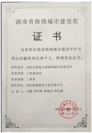 近日,由我集团下属岳阳南湖建设工程有限公司建设的洞庭大桥海绵城市项目,经岳阳市住建局推荐申报,荣获湖南省城市科学研究会颁发的工程建设类二等奖。这份荣誉既是对项目建设品质的高度认可,更是对公司专业实力与专业技术水平的充分肯定。