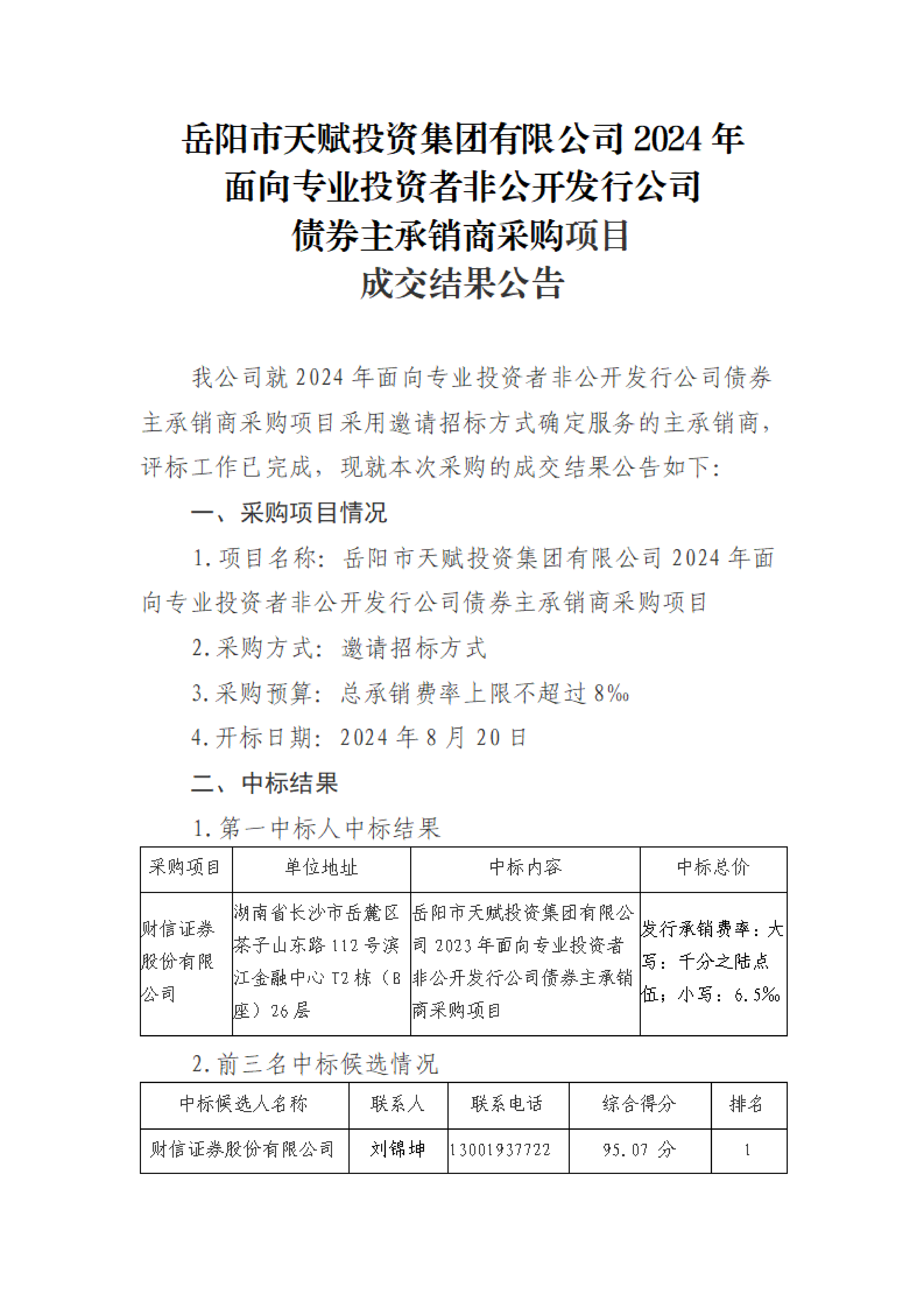岳阳市天赋投资集团有限公司2024年面向专业投资者非公开发行公司债券主承销商采购项目成交结果公告